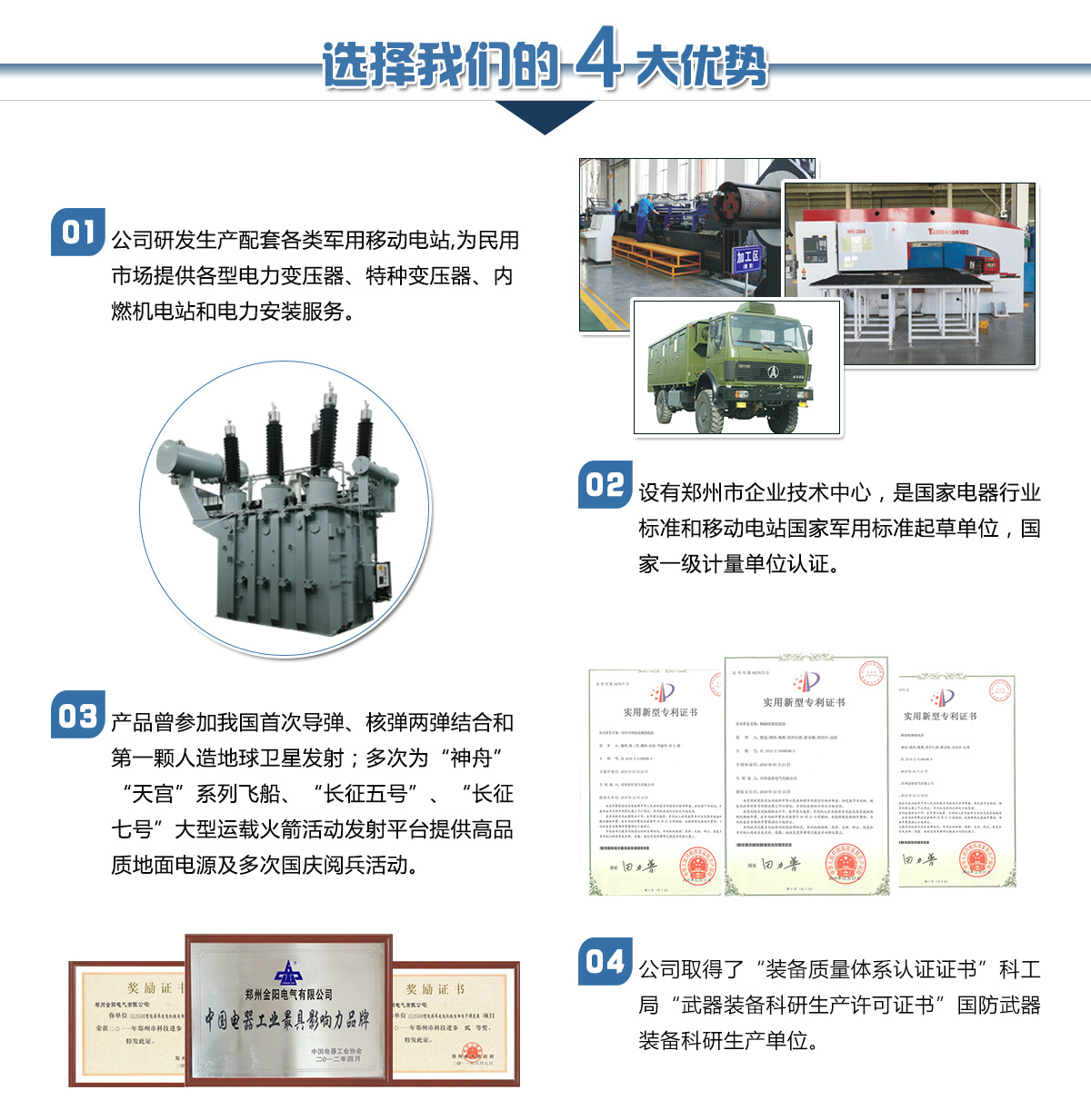 鄭州金陽(yáng)電氣有限公司是由鄭州市國(guó)資委控股的國(guó)有獨(dú)資企業(yè),是原機(jī)械工業(yè)部在上世紀(jì)五十年代投資建立的移動(dòng)電站和電力變壓器生產(chǎn)企業(yè)。公司下設(shè)電站公司和變壓器公司及其它配套公司,長(zhǎng)期以來(lái)在國(guó)內(nèi)移動(dòng)電站和電力變壓器行業(yè)占有重要位置。是河南省具備設(shè)計(jì)生產(chǎn)110kV電壓等級(jí)以上電力變壓器資質(zhì)的企業(yè),是國(guó)家經(jīng)貿(mào)委首批推薦城鄉(xiāng)電網(wǎng)建設(shè)與改造所需變壓器的生產(chǎn)企業(yè)。河南省變壓器檢測(cè)中心設(shè)在我公司。